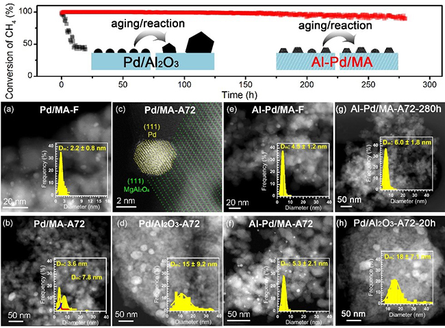 近日,我所催化与新材料研究室李为臻研究员、乔波涛研究员、张涛院士团队与北京大学马丁教授合作,在高稳定Pd基甲烷燃烧催化剂制备方面取得新进展,以镁铝尖晶石(MgAl2O4)为载体,通过添加非还原性氧化物(Al2O3, ZrO2, SiO2)抑制Pd的过度氧化,实现了Pd纳米粒子的高水热稳定性。