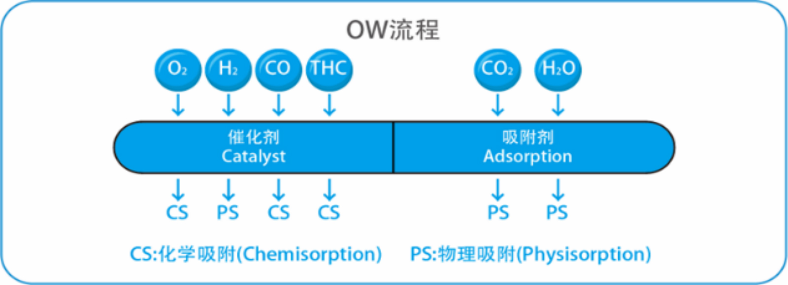 本纯化器采用OW流程对氮气进行纯化,原料氮气进入纯化器后,经过O(催化氧化)流程,利用高温贵金属催化剂特性,可将氮气中的杂质H