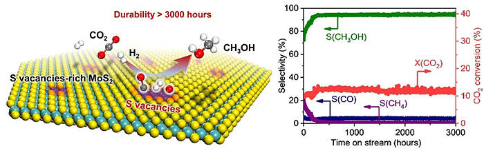 近日,我所催化基础国家重点实验室二维材料与能源小分子转化创新特区研究组(05T6组)邓德会研究员团队与厦门大学王野教授团队合作,在二氧化碳(CO2)催化加氢制甲醇研究中取得重要进展,首次利用富含硫空位的少层二硫化钼(MoS2)催化剂实现了低温、高效、长寿命催化CO2加氢制甲醇,其活性与选择性均显著优于商品Cu/ZnO/Al2O3催化剂,并显示出优异的稳定性。该催化剂为实现低能耗、高效率的CO2转化利用开辟了新途径。
