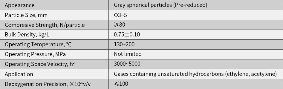 T-841 catalyst exhibits unique resistance to CO poisoning. It enables the removal of unsaturated hydrocarbons (ethylene, acetylene) at temperatures well below the CO disproportionation threshold of 250℃, while simultaneously demonstrating efficient hydrogenation conversion capability for oxygen. The catalyst is characterized by broad adaptability, high purification efficiency, and a wide operating temperature range.