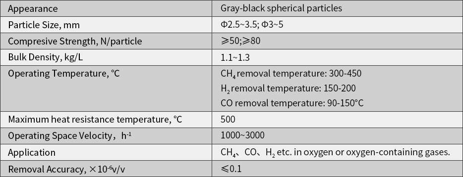 The OC-2 oxidant catalyst features a dual-functional mechanism for impurity removal: In the presence of oxygen, oxygen reacts with impurities such as CH₄, CO, and H₂ to form CO₂ and H₂O; under oxygen-free conditions, the catalyst itself provides oxygen to react with impurities CH₄, CO, and H₂, generating CO₂ and H₂O. This oxidant offers flexible application, achieving impurity removal both in the presence and absence of oxygen. It also exhibits notable characteristics, including low operating temperature for impurity removal, high purification depth, excellent thermal stability, and long service life.