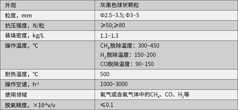 OC-2型氧化催化剂具有双功能脱除杂质机理:在有氧气下氧与杂质CH4、CO和H2反应生成CO2和H2O;在无氧气氛下催化剂本身提供氧与杂质CH4、CO和H2反应生成CO2和H2O。该氧化剂应用灵活,有氧、无氧存在均可以达到脱除杂质的目的,还具有脱除杂质温度低、精度深、耐热性能好、使用寿命长的显著特点。