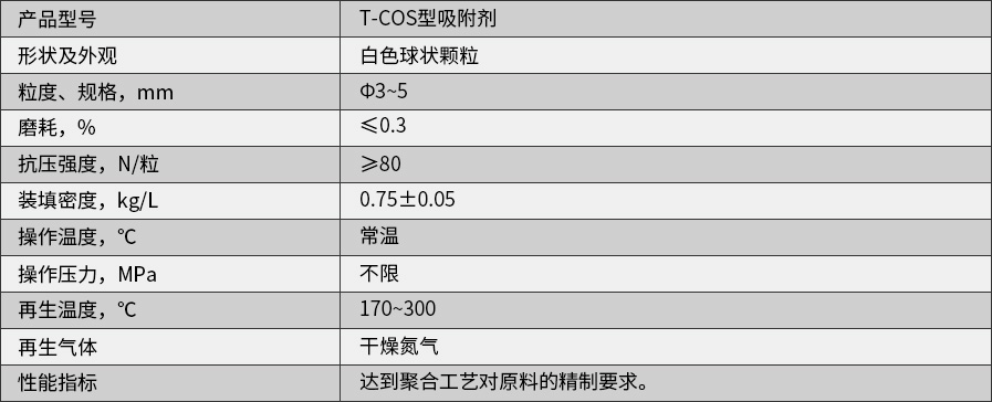 T-COS型吸附剂是一种光滑的吸附剂,它的特殊性能主要表现在可以选择性吸附来自于碳氢化合物气体中的COS、CO2和H2S。用于聚丙烯、乙烯以及催化重整过程中,具有很好的吸附能力,是一种能保护和增强催化剂寿命的吸附剂。